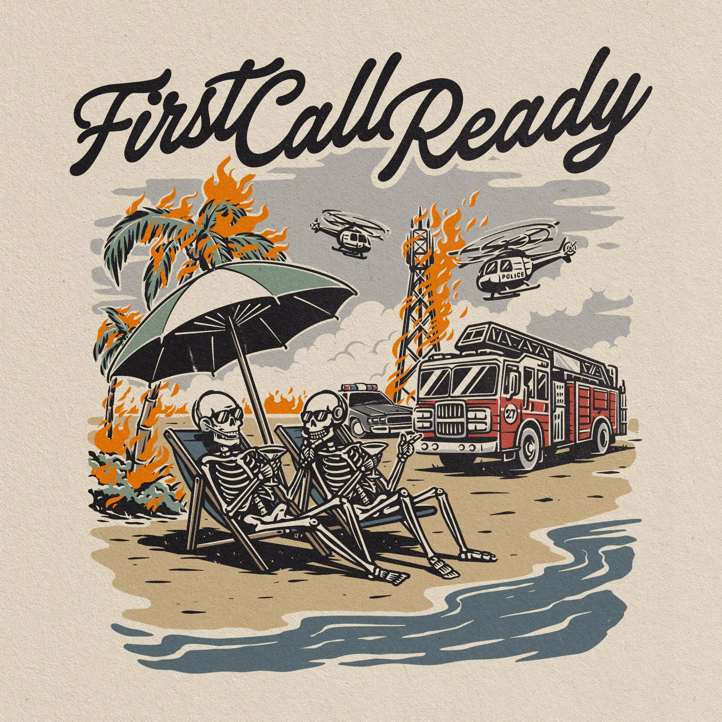 So we created something that felt both fun and a little bit too real: two skeletons kicking back with a drink on the beach, surrounded by their teammates… and absolute chaos. Because if you know dispatch, you know that sometimes the only way to survive the madness is to laugh, lean on your team, and enjoy the moment when you can.